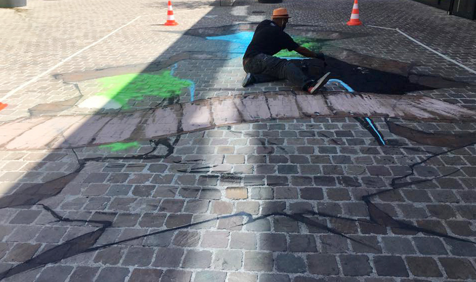 Creating a convincing anamorphic floor artwork requires a mix of artistic skill and technical preparation. We start by defining the viewing point and mapping the distortion grid on the paving or tiles. The design is then painted using high-quality pigments and exterior-grade products suitable for heavy pedestrian traffic, with anti-slip finishes to ensure full safety for visitors. Our experience with demanding environments – whether in fitness and sports halls in Dubai or high-traffic corporate office spaces – guarantees a finish that respects both aesthetic expectations and operational constraints.