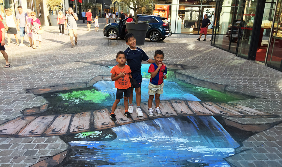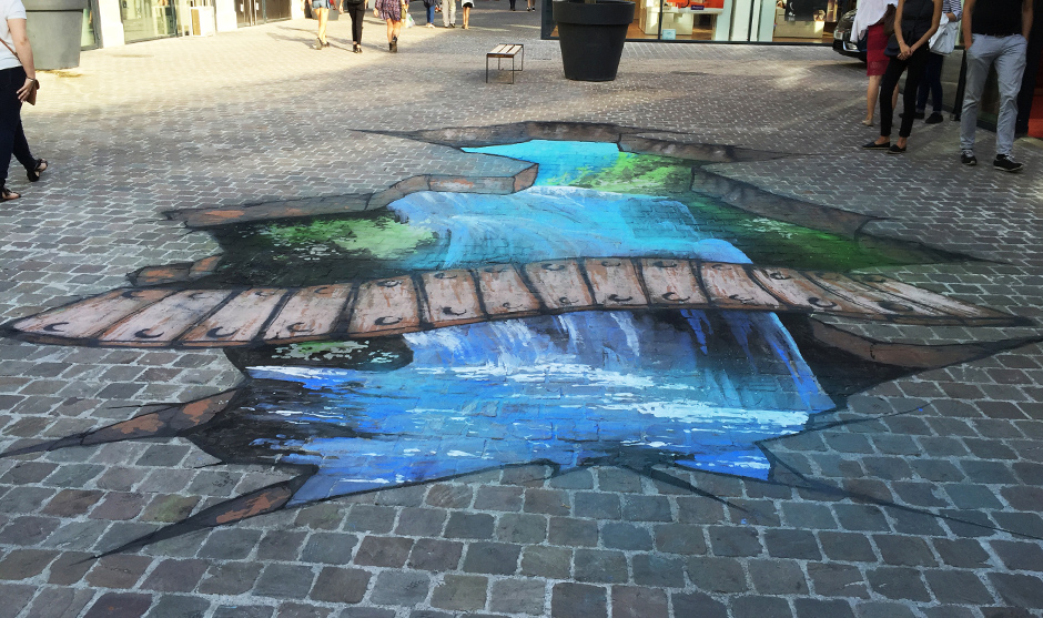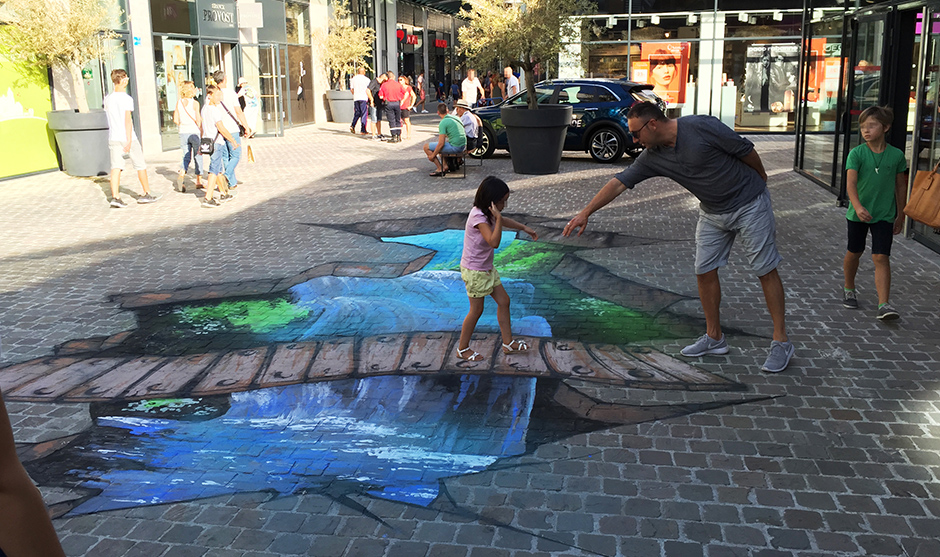 Imagine a busy mall corridor in Dubai suddenly opening onto a wooden bridge suspended above a waterfall. Our 3D floor art installations use anamorphic perspective to transform neutral walkways into immersive illusions that shoppers can literally step into. From a single vantage point, the artwork appears to break the floor open, revealing a dramatic scene that instantly catches the eye and stops people in their tracks. This kind of anamorphic painting is ideal for shopping centres looking to differentiate themselves from neighbouring malls and create a signature visual moment within their retail environment.