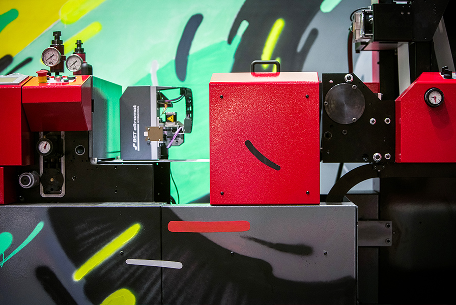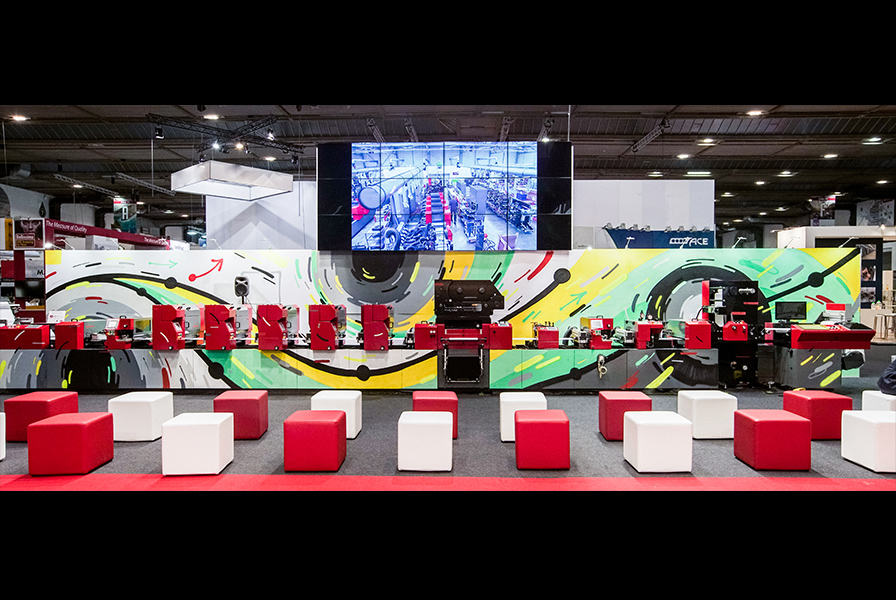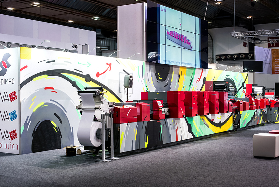 On this project, the brand wanted an installation that would transform a technical machine into a visual magnet. We developed an abstract composition inspired by the movement of printing cylinders. The artwork extended across the machine and onto the wall behind it, making the whole structure blend into a vibrant graphic flow. Visitors stopped to understand what was happening which immediately created conversations with the sales teams. This is the same dynamic we often observe in other activations such as our live graffiti installations for large outdoor events where the artistic gesture becomes the entry point for brand interaction.