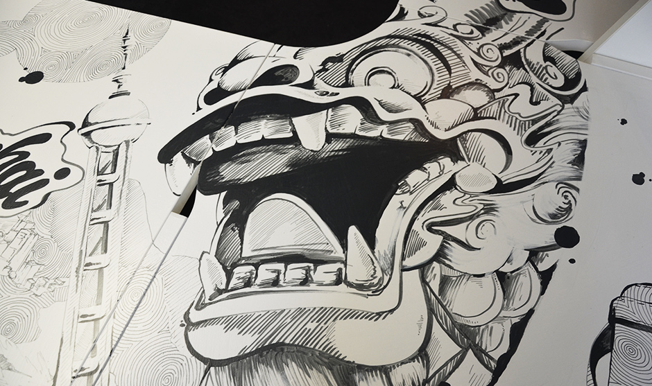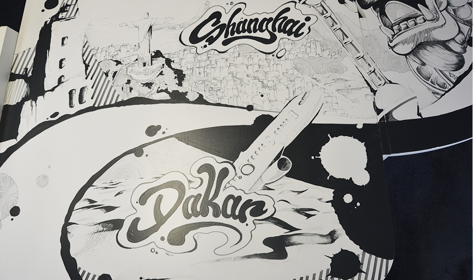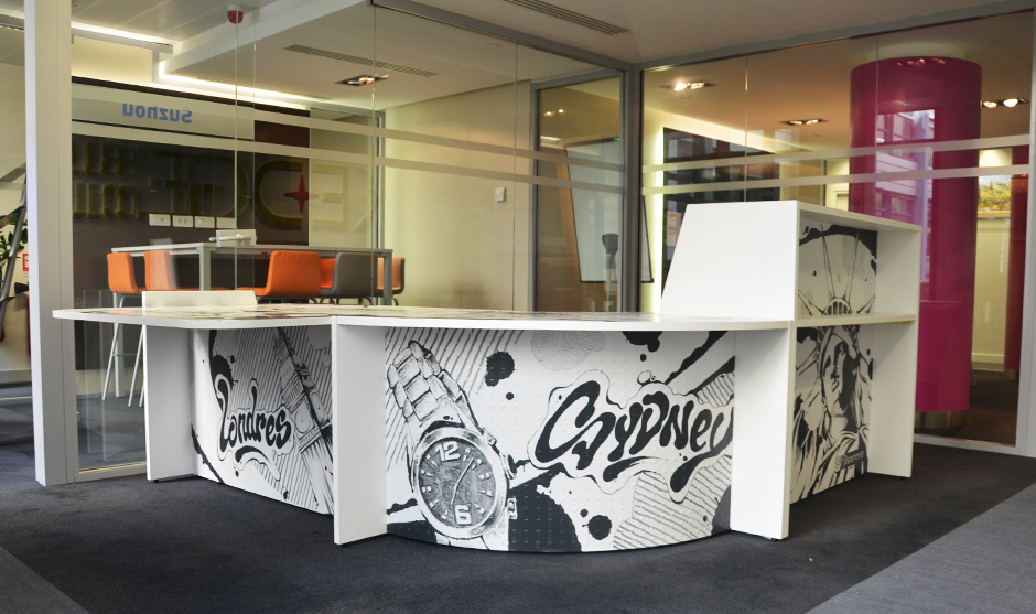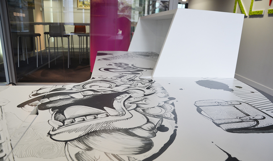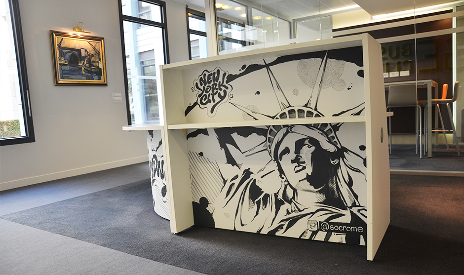 The project originally developed for Kedge Business School in Paris is a strong example: a fully hand-painted reception desk illustrating the concept of the “globe manager.” Iconic landmarks from the school’s international campuses blended with objects from the business world—watches, planes, notebooks, cityscapes—resulted in a piece that is both functional and visually striking. The artwork became a conversation starter and a cultural marker within the school.
