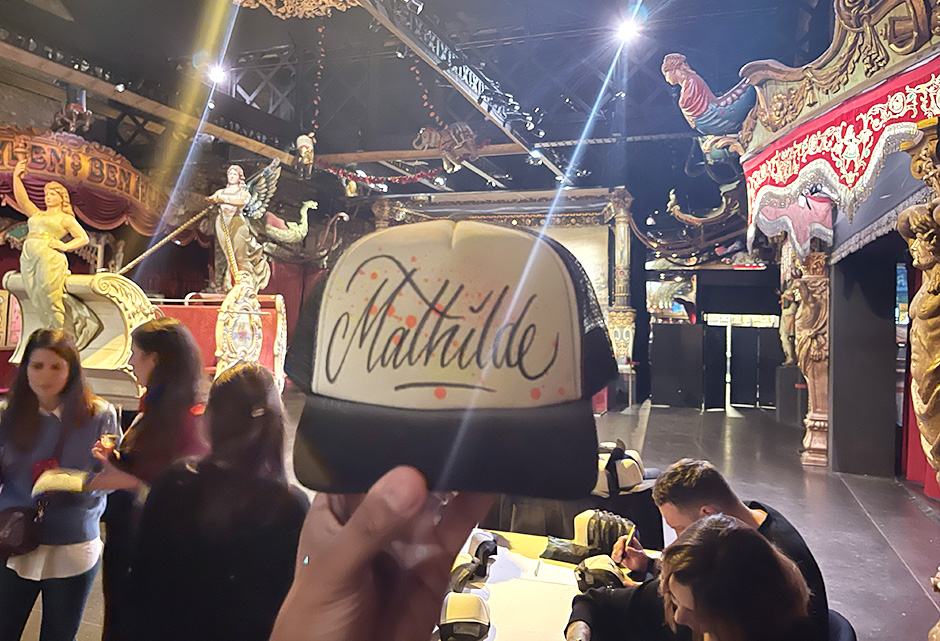At the Cap Bar, guests approach the artist’s table, share their name, and within seconds, see it appear on a sleek trucker cap — drawn in one expressive motion, using bold calligraphic lines and custom color accents. The result: a personalized, wearable artwork created right before their eyes. It’s spontaneous, fast, and irresistibly engaging. In corporate events, it becomes a social magnet that connects people; in private parties, it’s a playful, stylish souvenir guests take home with pride.
