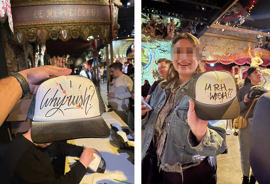 Each live cap personalization session is an artistic performance. The quick, confident gestures of our artists create an instant wow effect, much like our Montblanc live painting experiences or Jimmy Choo Bamboo Fans activation. It’s a moment of pure interaction — people film, share, and talk about it — amplifying your event visibility both on-site and online.