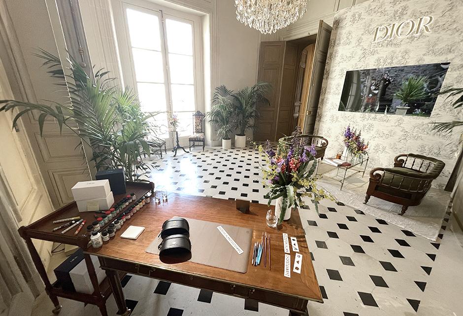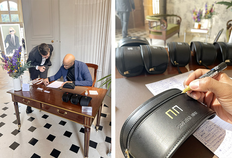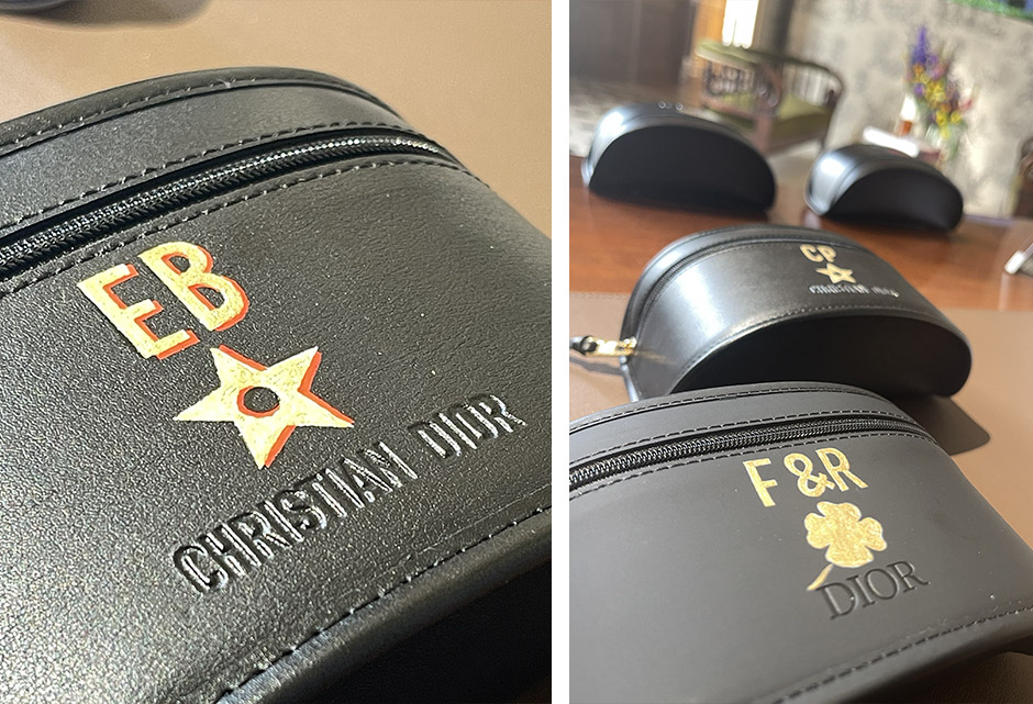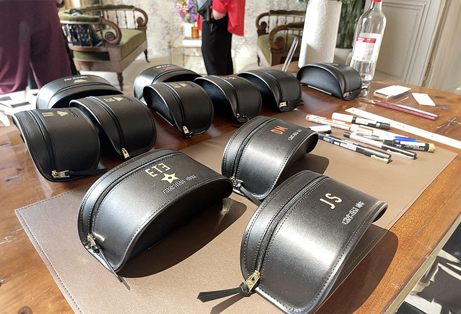 Our artist, known for his expertise in leather personalization, worked from an atelier-style desk arranged inside the Dior showroom. Throughout the week, partners and buyers from around the world were welcomed to discover the eyewear collections and request custom initials or monograms. Each case was meticulously hand-painted using premium pigments and fine brushes — a level of detail that resonates strongly with luxury clients.