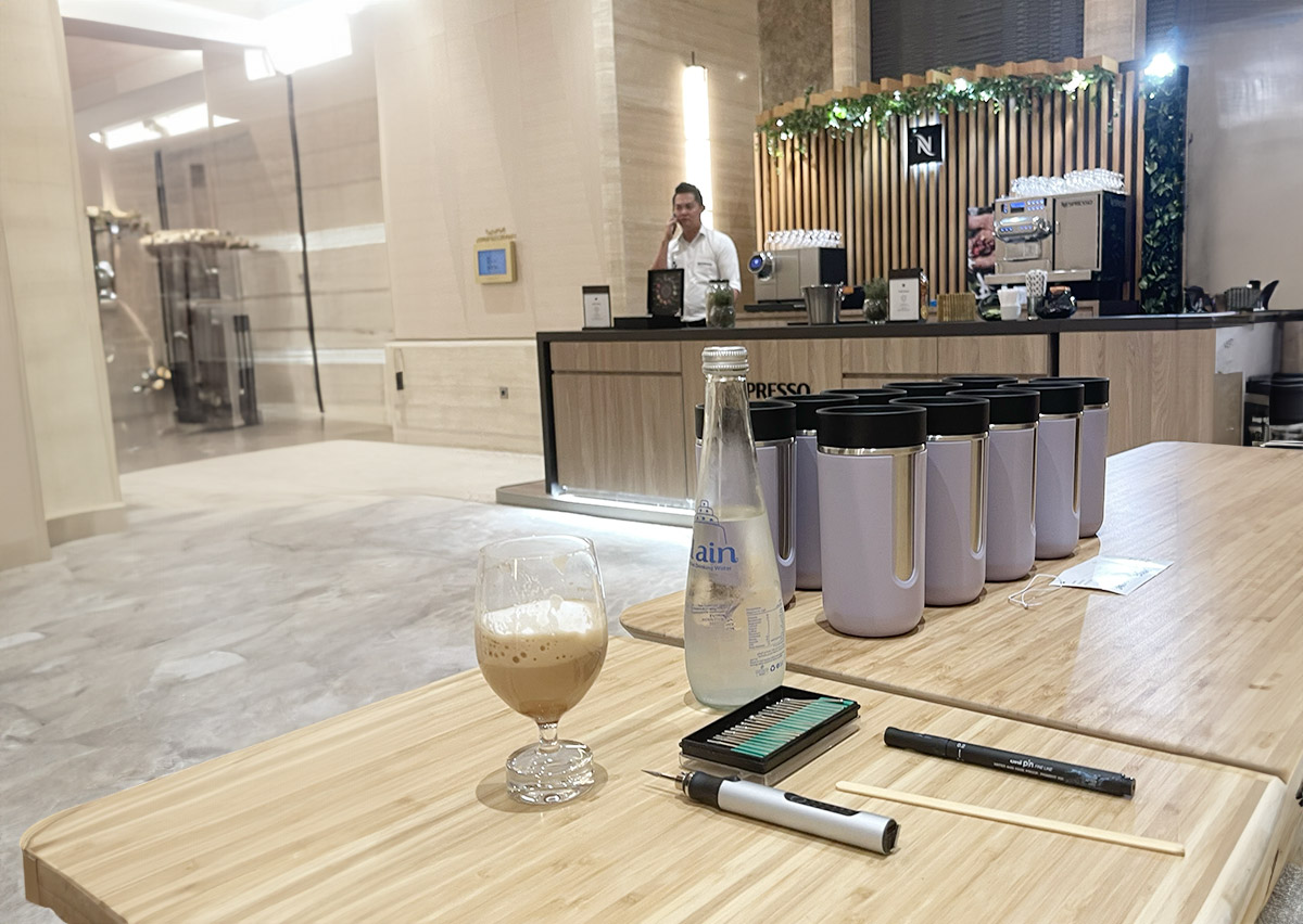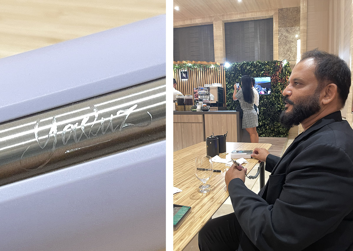Unlike traditional painting or hand-lettering, engraving offers a distinctive aesthetic — permanent, tactile, and sophisticated. Our artists used precision engraving tools to etch each participant’s name in a refined metallic finish, creating a bespoke keepsake that reflected the brand’s modern and sustainable DNA. This type of activation not only stands out visually but also reinforces the sense of exclusivity associated with high-end corporate events. Similar techniques were showcased in our Nescafé corporate event in Dubai and Montblanc luxury activations.
