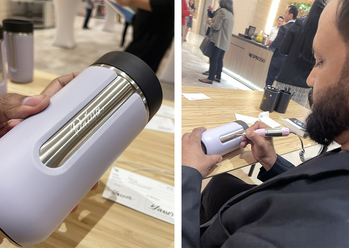 At the crossroads of craftsmanship and brand experience, Graffeur Paris Dubai collaborated with Nespresso for an exclusive corporate event held in one of Dubai’s most prestigious venues. During this private gathering, designed for key business partners and executives, our team delivered a refined activation: engraving personalized names on stainless steel mugs. This premium touch elevated the event’s atmosphere, combining precision, artistry, and innovation — perfectly aligned with Nespresso’s image of excellence.