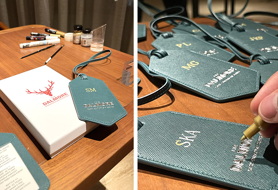 Leather has long been associated with craftsmanship, heritage and durability — three notions that echo Dalmore’s identity. Throughout the event, each guest was invited to choose a luggage tag crafted in premium textured leather, then personalized live by our artist Hakim Idriss. Initials, monograms and delicate gold touches were painted by hand, turning a simple accessory into a symbolic keepsake.