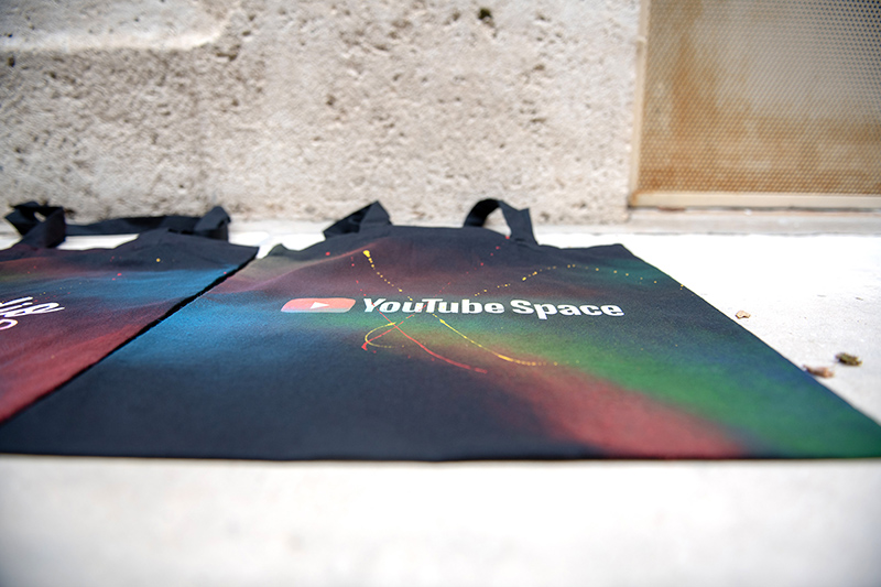 For this large-scale celebration, our artists personalized cotton tote bags with names, YouTube channel titles, emojis and creative symbols, all using a custom colour palette inspired by Google’s identity. Achieving this level of variety and consistency requires advanced technical preparation — from controlling drying times to mastering the right tools for fabric. These techniques are the same ones we apply today in the UAE for activations such as live cap customization for Dubai events or creative retail installations for Lacoste corporate experiences.