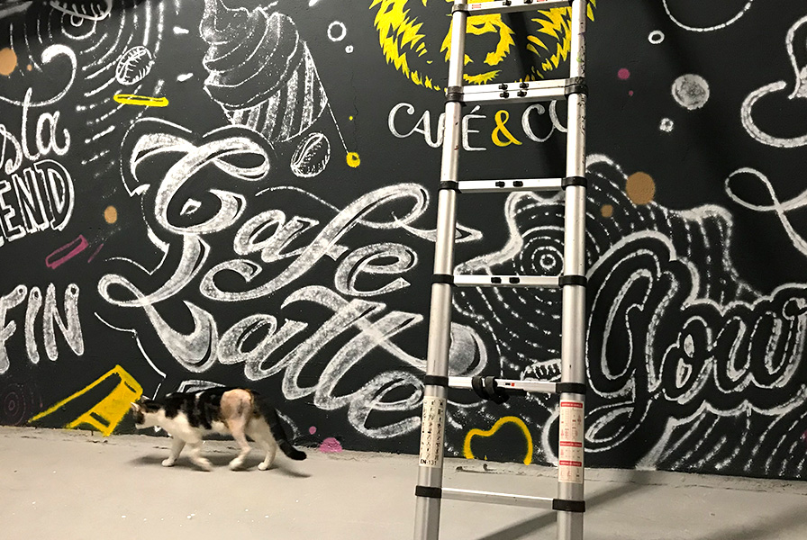 In this meeting room, the chalk-like effect of the artwork creates the feeling of a giant hand-drawn slate, echoing the world of cafés, barista culture and craft-made recipes. The anthracite background adds depth, while the typography and illustrations bring immediacy and character. The result is far removed from the neutral décor often found in office spaces across the UAE. Instead of a static room, the company gains a living space aligned with the same spirit that guides large-scale typographic works such as the restaurant wall art project in Dubai inspired by our Rabat mural or the crafted walls seen in the hand-painted burger restaurant mural in Dubai.