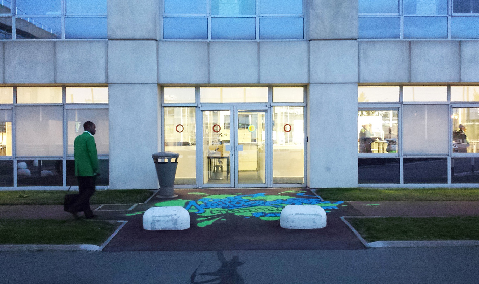Floor graffiti invites participation. Guests naturally stop, observe, photograph and share. At Transavia’s event, employees wrote messages around the artwork, turning it into a communal creative space—an approach that echoes the participatory dimension of our large team-building walls such as the Coloring Wall activation or the creative workshops delivered for Safran.