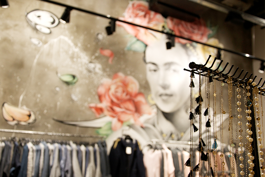 Nothing is more similar to a shop than another shop. Same colors, same furnitures, same matters… even if designers are doing their best to imagine and configure the best solutions, in our opinion the result is often tasteless and without a real soul. Art can be a nice and original way to bring humanity in those commercial spaces. The proof is that project in this shop of women ready-to-wear clothes.