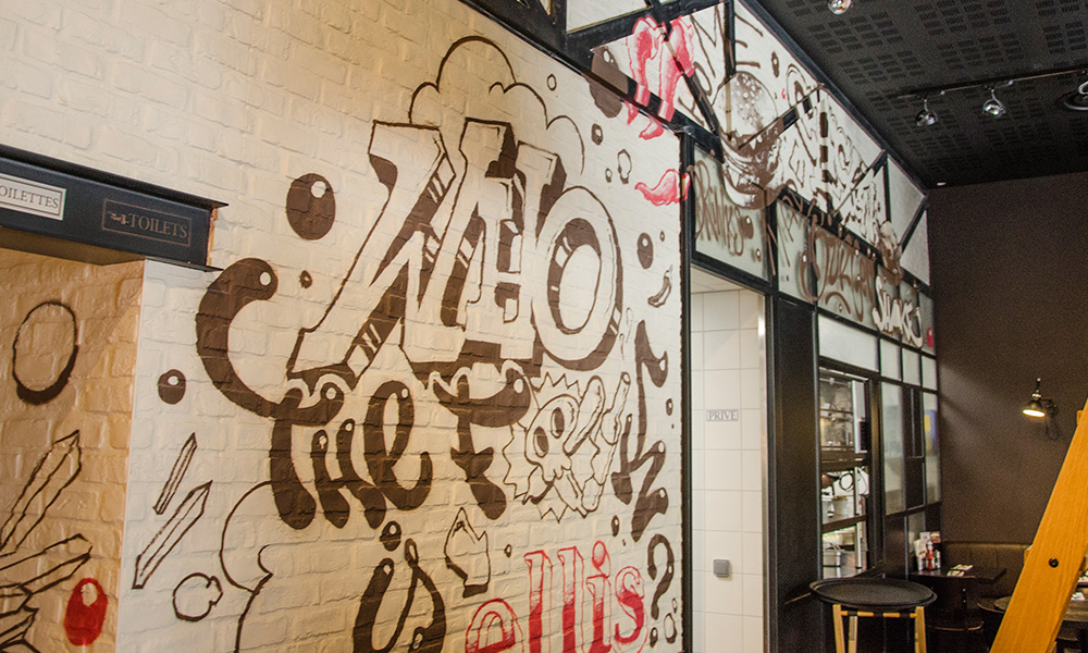 In the collective imagination, burgers and hand-lettering go together naturally. Blackboard menus, chalk lettering and vintage signage are part of the visual culture of burger joints. By painting the wall directly, we keep that authenticity but with a contemporary twist. On this Ellis Gourmet Burger wall, typography dominates the composition: large questions, playful sentences about food, and small details hidden in the corner of the mural invite guests to look closer while they wait for their order.