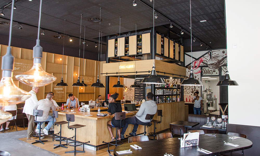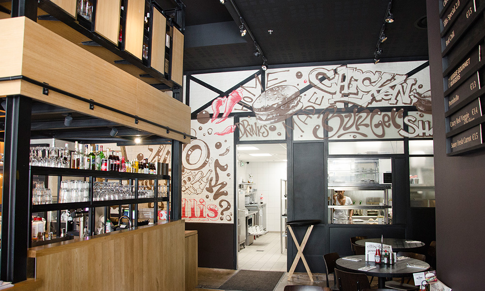 A custom mural is rarely just about decoration. In a burger restaurant, it can guide guests toward the counter, suggest signature recipes, highlight the origin of the ingredients or celebrate the neighbourhood. At Ellis Gourmet Burger, the wall art works hand in hand with furniture, signage and the open-kitchen area, just as we do when we collaborate on broader interior design concepts for agencies and commercial spaces.
