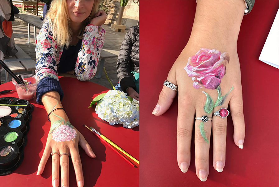 On site, the setup is simple and light. A table, comfortable chairs, a curated colour palette and an artist who welcomes each guest, discusses their favourite flowers and then paints a unique piece directly on the hand, forearm or shoulder. The work is done with skin safe, washable professional paints. The result lasts for the evening, sometimes a bit longer, which is perfect for events that want impact without permanent commitment.