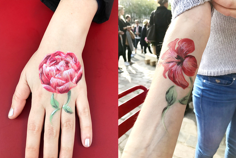This is the same know how we bring when we design full scale artistic environments for flagship boutiques or malls, as seen in our collaborations with international maisons in Paris and Dubai, our work for Rimowa, or our custom activations for watch and fashion brands in the GCC. Hand painted flower tattoos simply add another layer of human connection, at eye level and at hand level.