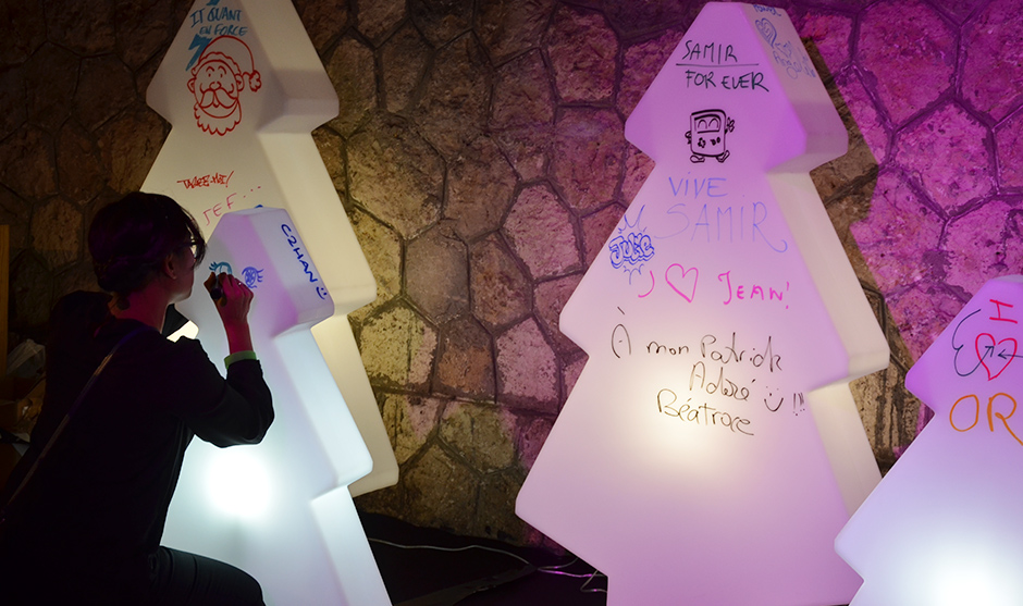 A second creative layer of the HSBC 80s Party came from the glowing, transparent columns installed around the space—structures on which guests could freely customise messages throughout the night. This dual system worked extremely well: • live art that guests could observe and photograph • participatory art that allowed them to contribute This is a formula we often recommend for Dubai events, and one we have already implemented successfully in projects like the Handmade Photo Wall or outdoor activations such as On The Move Live. It brings people together, encourages creativity even among the shyest participants, and creates content for both internal communication and social media.