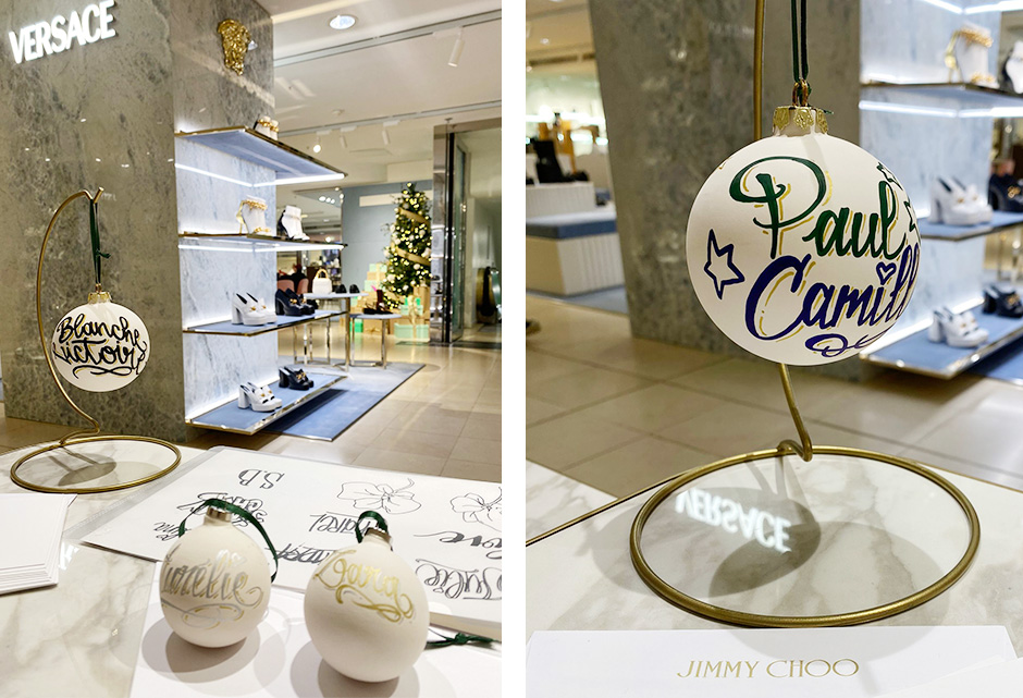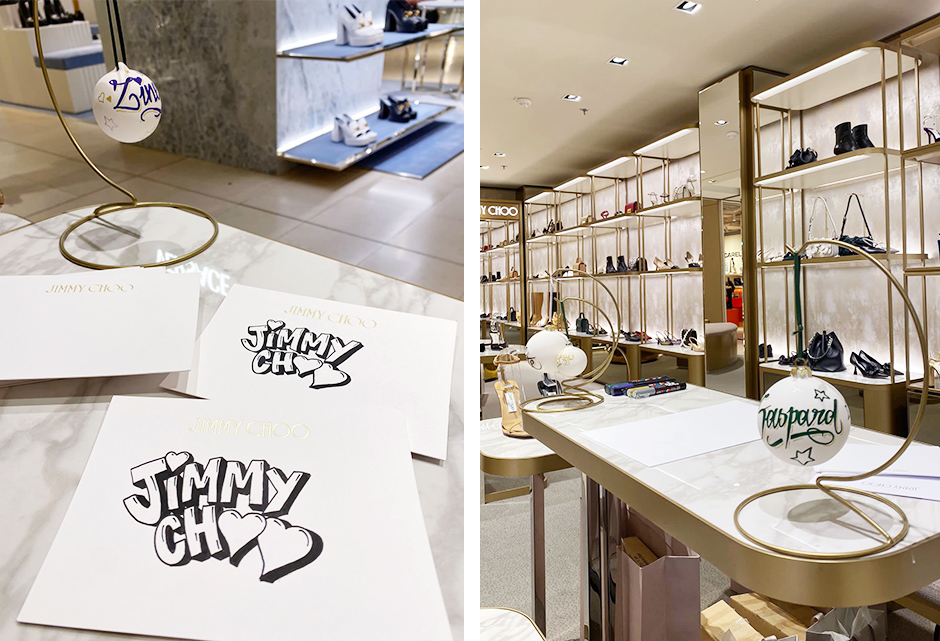 During the festive season, Jimmy Choo Dubai partnered with Graffeur Paris Dubai to create a bespoke in-store experience that transformed holiday shopping into a moment of art and emotion. Inside the boutique, our live artists hand-personalized elegant Christmas ornaments — delicate custom Christmas baubles in Dubai — offering clients the joy of taking home a meaningful keepsake, crafted in front of them with their name or the name of a loved one.