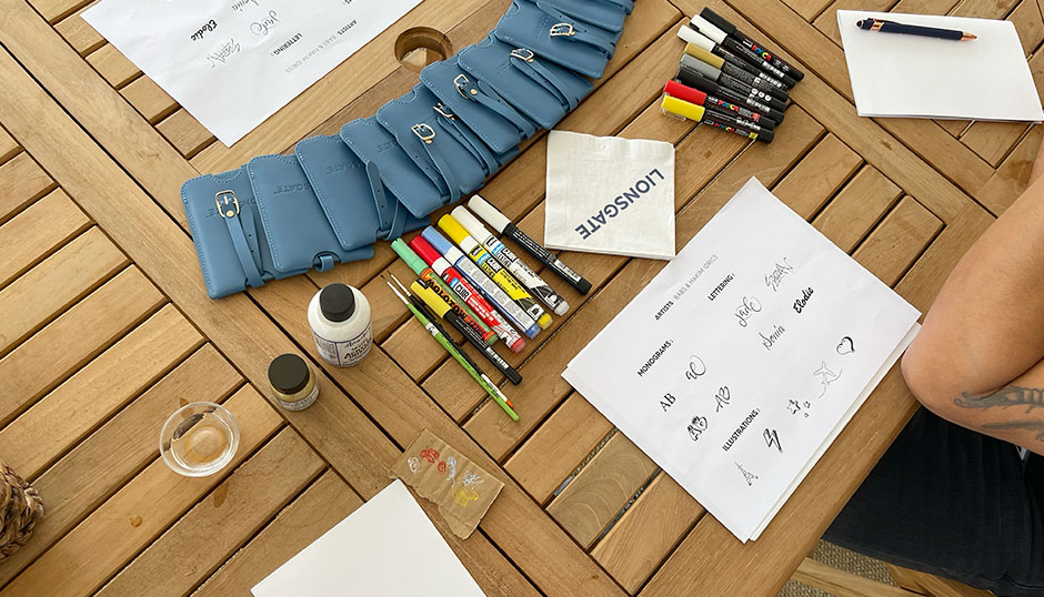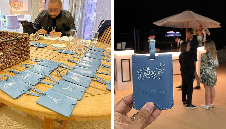 At a private beachfront reception in Cannes, Graffiti Dubai partnered with the American studio Lionsgate to deliver a refined leather personalization experience on travel tags. Guests were invited to choose initials, names, or small illustrative details, hand-painted live with archival acrylics and clean calligraphic lines.
