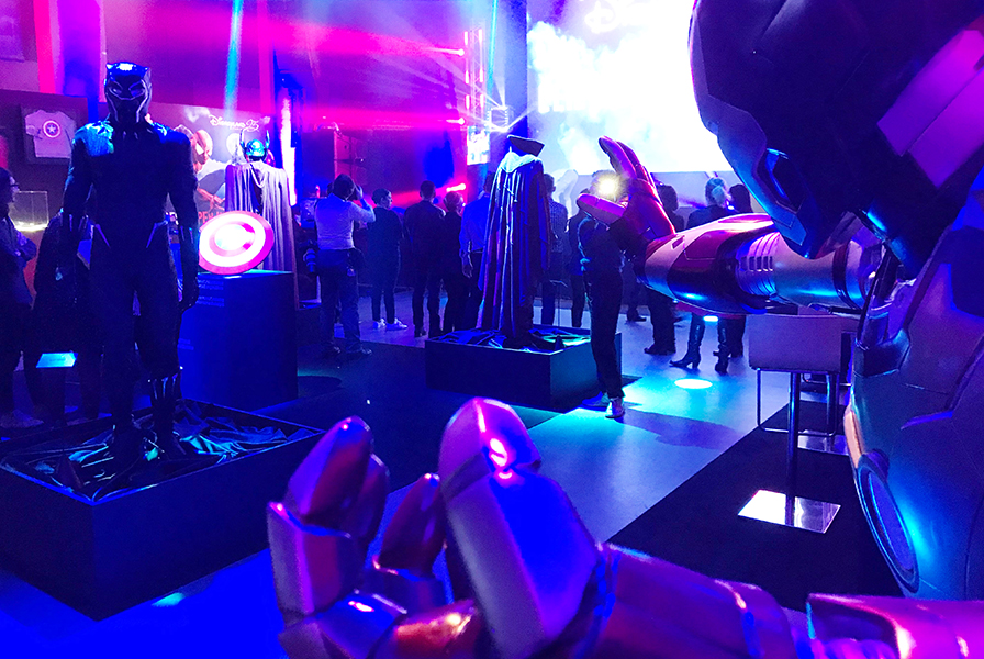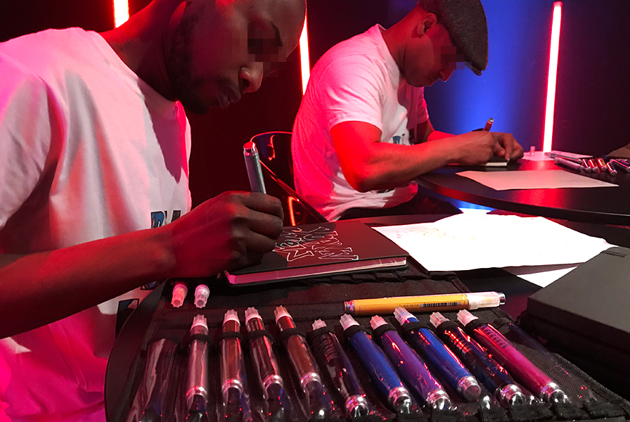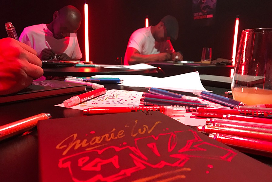 When Disney invited us to take part in a private Marvel launch event, the brief was clear: create a graphic experience that felt as energetic as the heroes on screen, while offering every guest a truly personal souvenir. The evening was hosted in a club-style venue, with dramatic lighting, Marvel costumes on display and large-scale visuals setting the scene. In the middle of this immersive set-up, our team of four graffiti artists spent the night customising black notebooks for VIP guests, influencers, journalists and close partners of the brand.