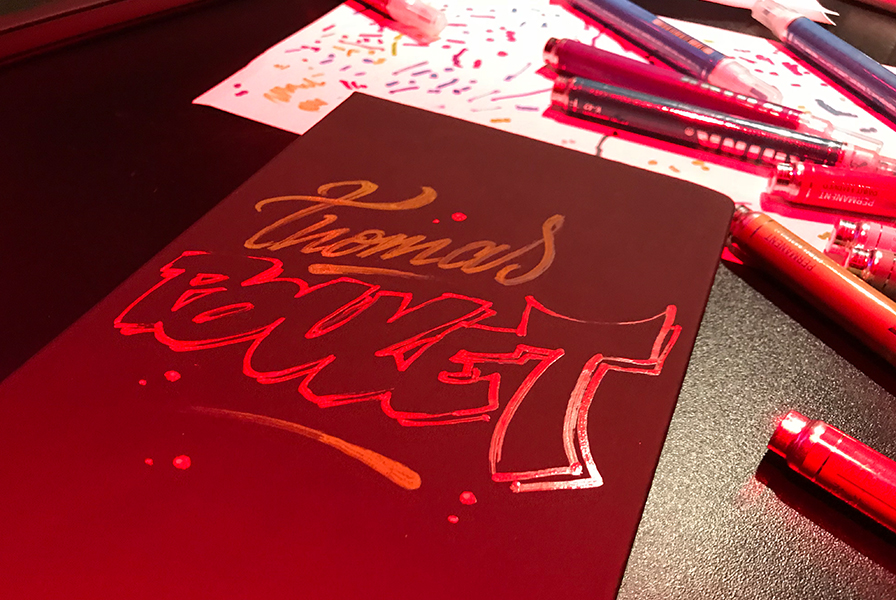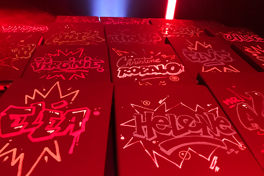 Each notebook became a small canvas. Names, nicknames and social media handles were written in bold, playful graffiti lettering, layered with metallic and fluorescent highlights. Instead of a generic gift, every attendee left with an object that carried their own identity and the visual energy of the Marvel universe. The format was deliberately compact and mobile: the artists worked from a minimalist desk set-up, which meant the activation could easily have been placed in any lounge, private room or backstage area of a premium venue in Dubai as well.