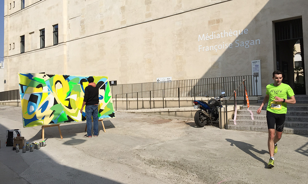 Instead of keeping the race route strictly functional, organisers can turn one key spot into a creative checkpoint: a large-scale graffiti canvas installed along the course, where an artist paints continuously while runners pass. The wall becomes a moving backdrop of colour and abstract shapes that mirrors the flow of the race, much like we already do for other outdoor live art performances in the city. The piece is visible from far away, giving participants a visual target and adding a memorable moment to the route.