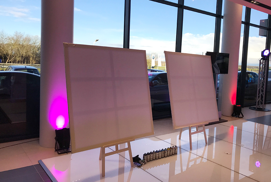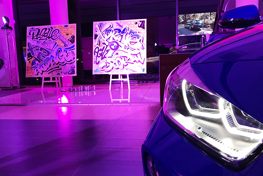 Live art is one of the most adaptable activations an automotive brand can choose. The artist can be placed almost anywhere inside a showroom—near the vehicle, at the entrance, or within the reception area—without disrupting the event flow. For BMW, two separate canvases were created instead of a single large piece, offering additional versatility: they could be displayed side by side, positioned in different spaces, or even gifted to VIP clients or new owners. This format also echoes other flexible event artworks we have delivered, such as live car painting performances or graffiti customization on luxury retail furniture.