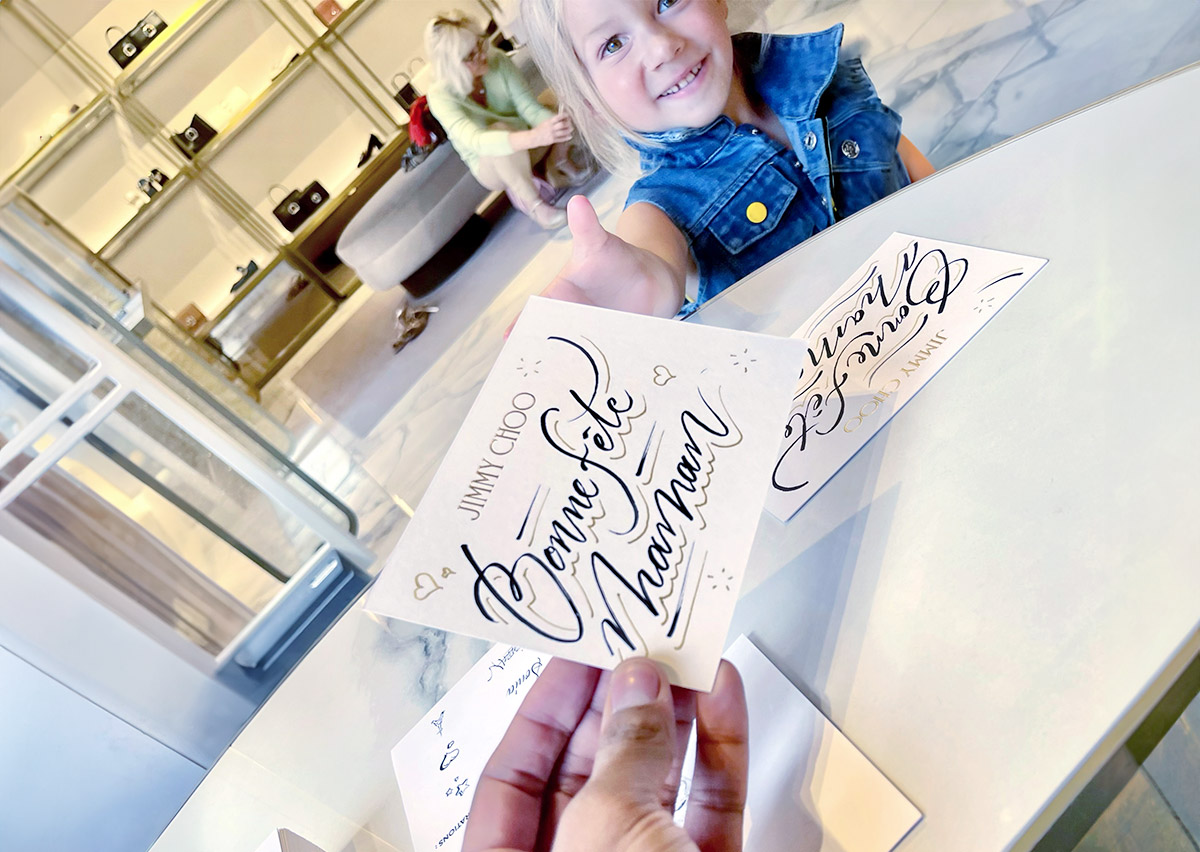 Unlike digital activations, live sketching brings a human touch that resonates with high-end audiences. Each drawing, made in real time, becomes a keepsake of the moment — signed, elegant, and deeply personal. Clients appreciate not only the artwork but also the one-on-one interaction with the artist, making the shopping experience far more memorable. These activations can be adapted to seasonal campaigns such as Mother’s Day, Ramadan, Christmas, or brand anniversaries, just like our hand-painted bamboo fan activation for Jimmy Choo or Tumi leather tag personalization.
