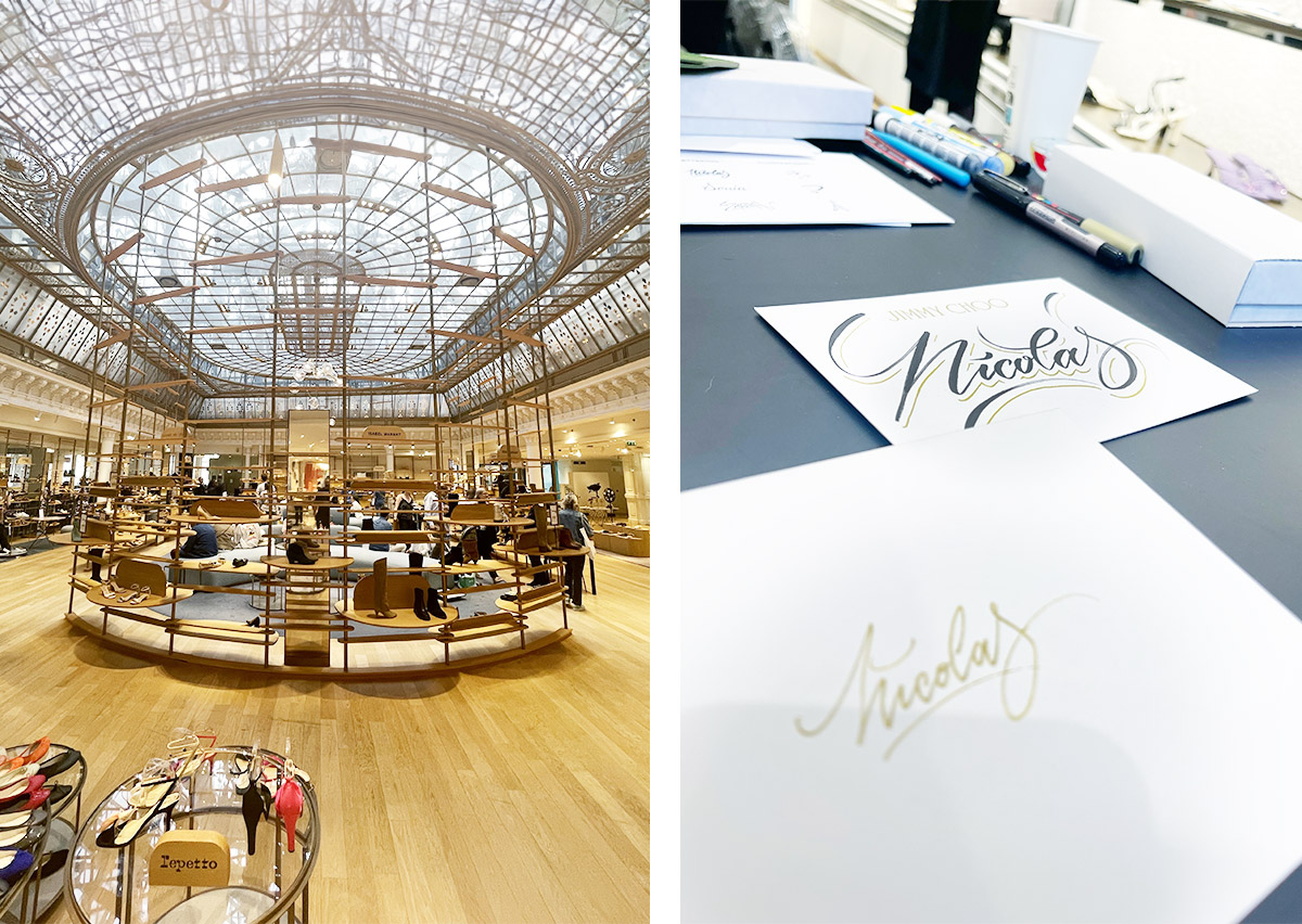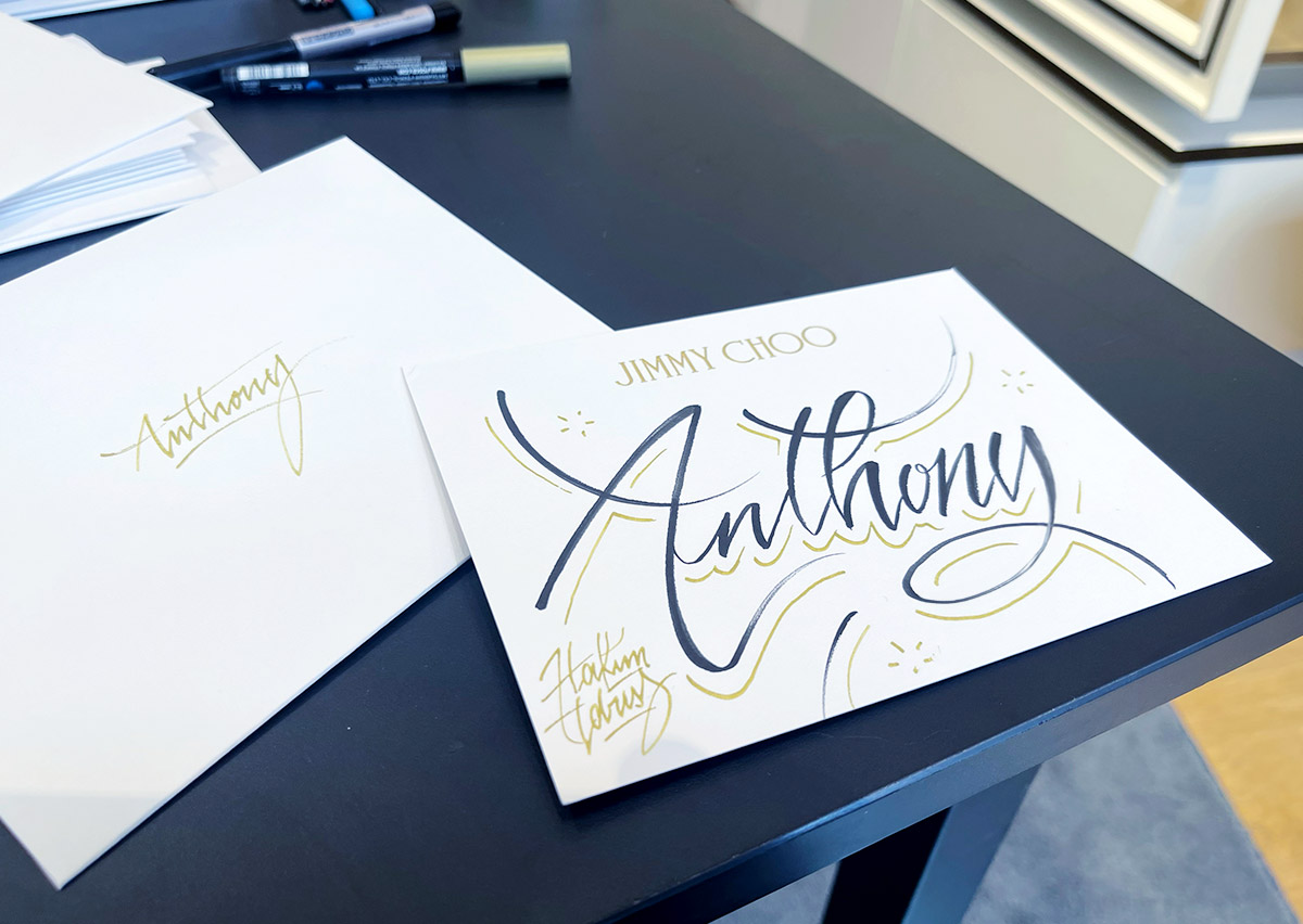 For this activation, our artist hand-painted initials, names, and personal notes in gold and white ink onto premium green leather travel tags, creating subtle yet sophisticated keepsakes. Each piece reflected the essence of Jimmy Choo — refined, modern, and personal. The event also featured on-the-spot calligraphy on branded cards, blending craftsmanship with the intimate pleasure of receiving a custom message. This combination of artisanal detail and human interaction transforms the boutique into a space of shared emotion, where art and luxury coexist.