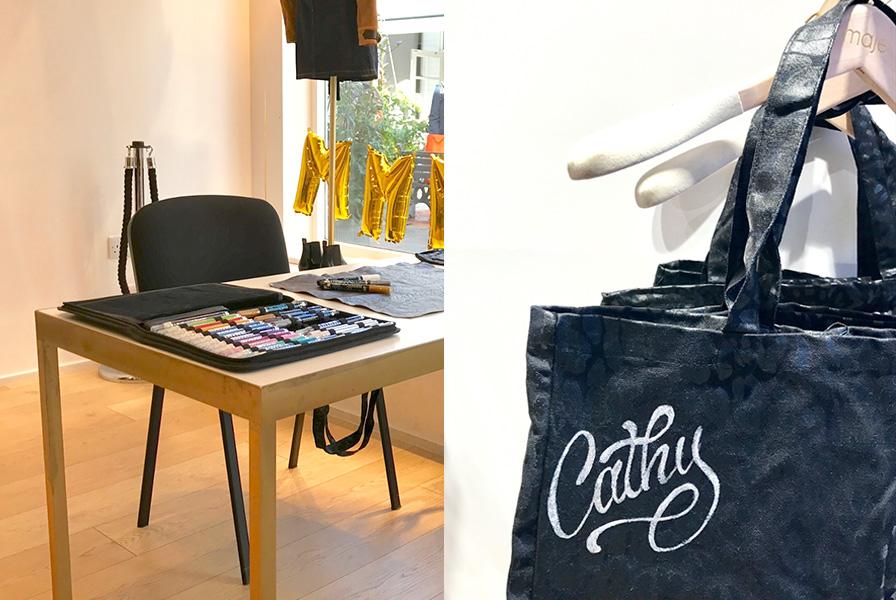So our talented street artist and calligrapher Socrome spent 3 hours in the shop to draw beautiful letters on Maje tote bag with silver and gold colors.