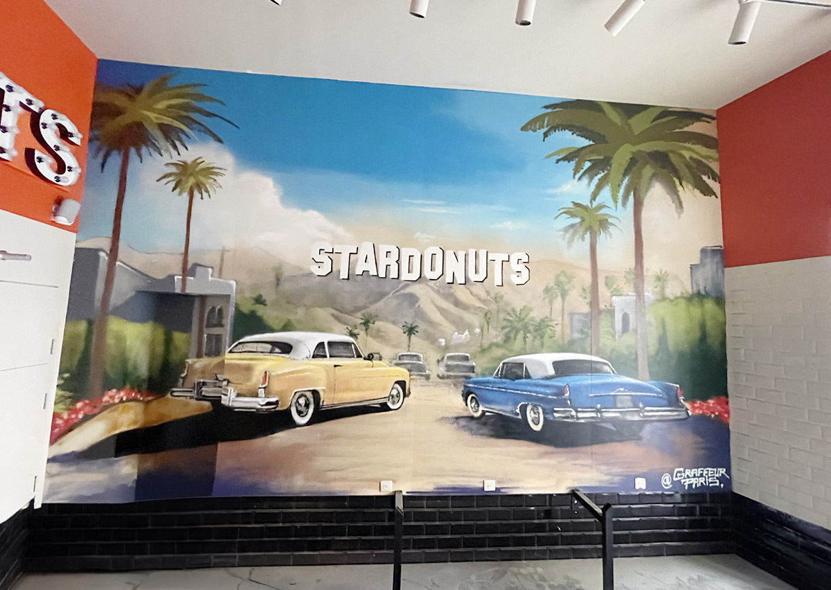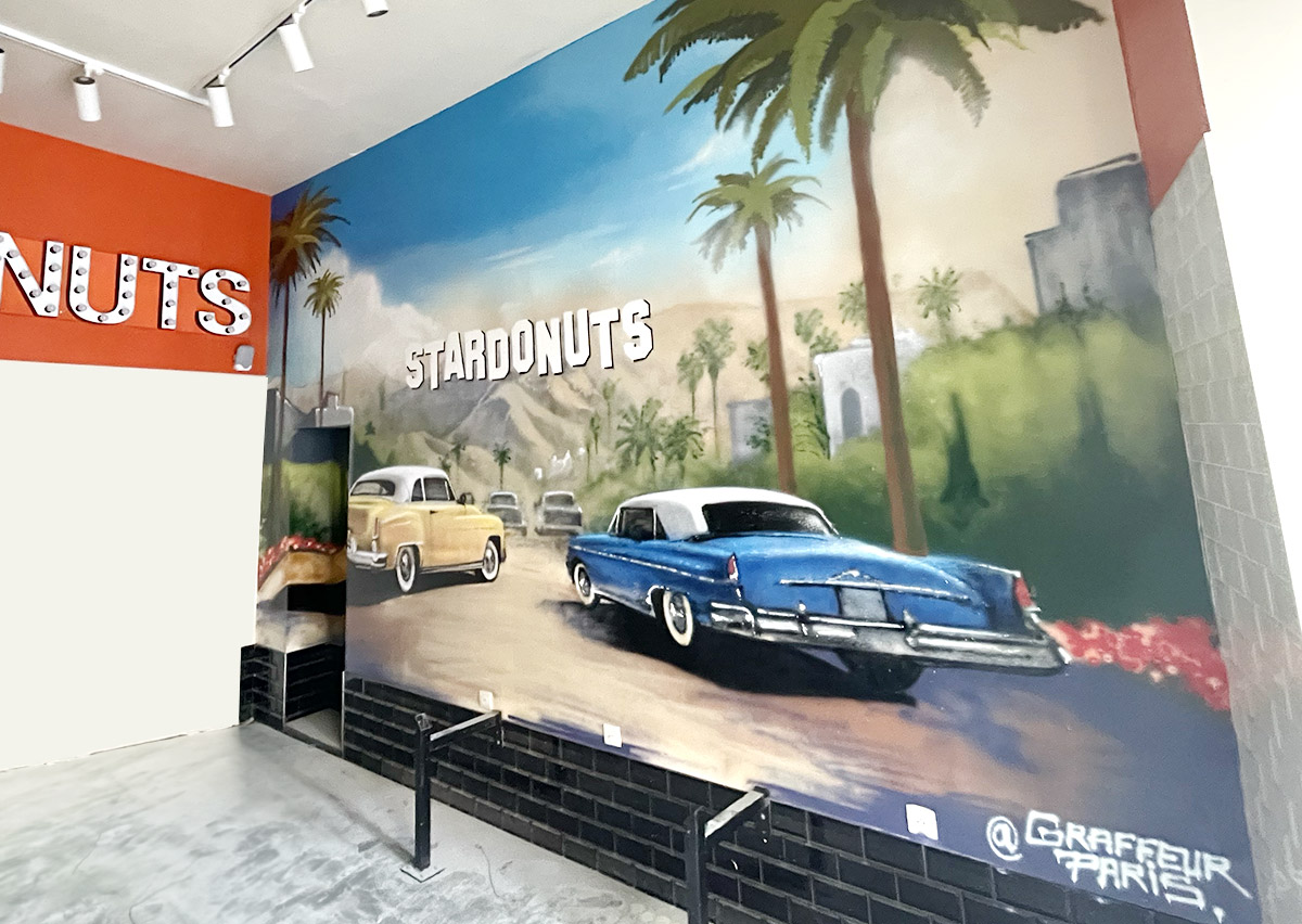 In Dubai’s ever-evolving food scene, design is more than decoration — it’s a key part of brand experience. For the launch of Star Donuts, Graffeur Paris Dubai transformed a plain wall into a vibrant, colorful backdrop that immediately captures the joy and energy of the brand. The result: a mural that turns every customer visit into an Instagram-worthy moment, blending urban art with playful pop culture references — perfectly suited to the city’s café culture.