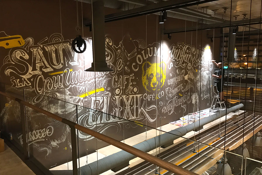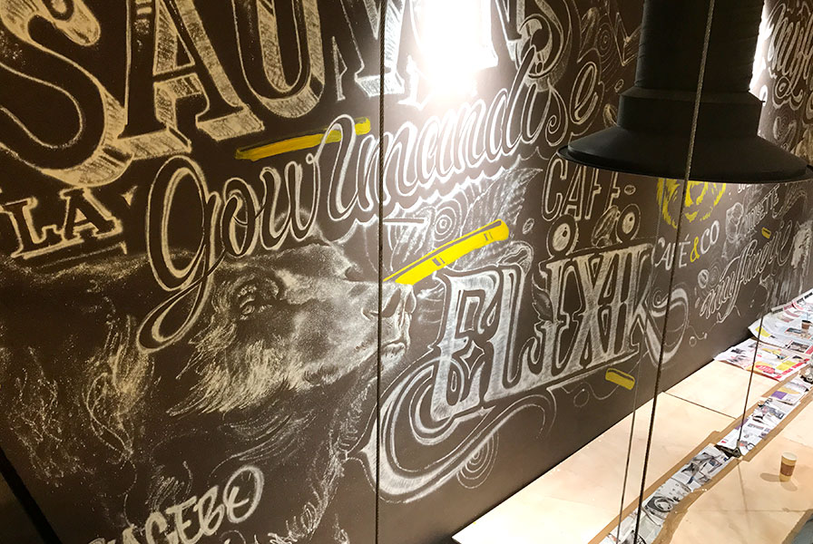 For restaurant owners or hospitality groups in Dubai and Abu Dhabi, this type of intervention can be replicated and adapted, whether the goal is a warm typographic world, a bold contemporary graphic piece or something more figurative, as seen in other projects like our Nespresso live personalization event or our handmade custom photo wall. The objective remains the same: elevate the venue and give it a signature visual identity.