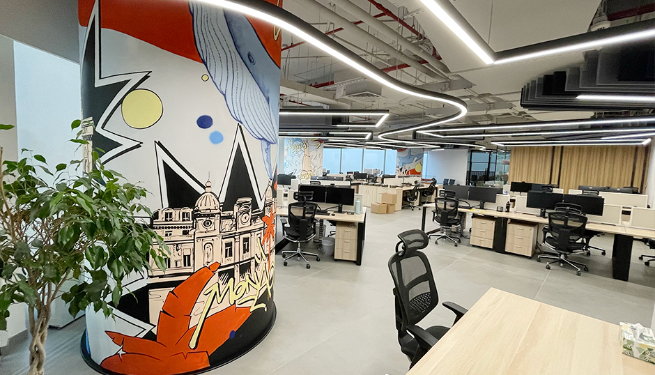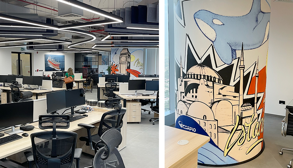 What began as a traditional office design brief quickly evolved when Scorpio’s leadership made a statement that guided the entire project: “We are not THAT serious.” That sentence became the creative trigger for the studio to move beyond conventions and introduce joy, movement, and personality into the space. The final compositions mix marine imagery, dynamic lettering, and urban motifs — reflecting a brand that values ambition and creativity as much as precision and performance.