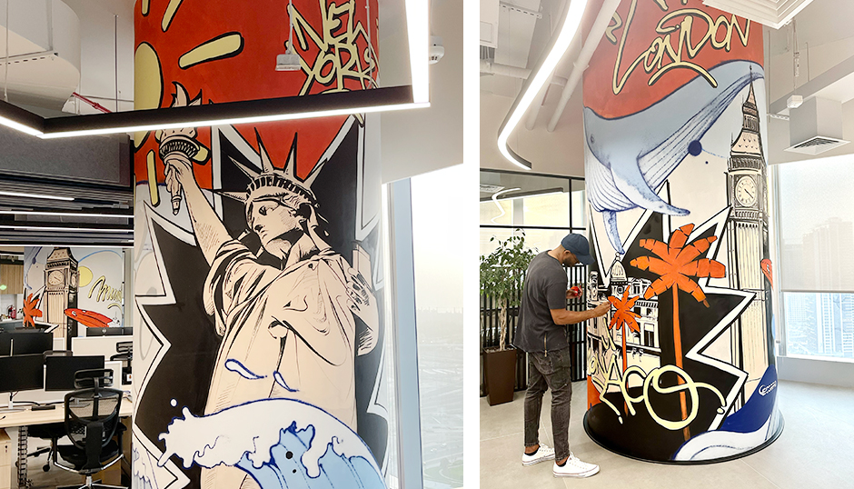 Each of the three four-meter-high columns was transformed into a vibrant storytelling surface. Combining street art aesthetics, architectural illustration, and bold color dynamics, the design celebrated global destinations such as Monaco, New York, London, and Istanbul — echoing the company’s international reach. The result was a series of monumental pillars that turned a functional office into a visually engaging and inspiring workspace.