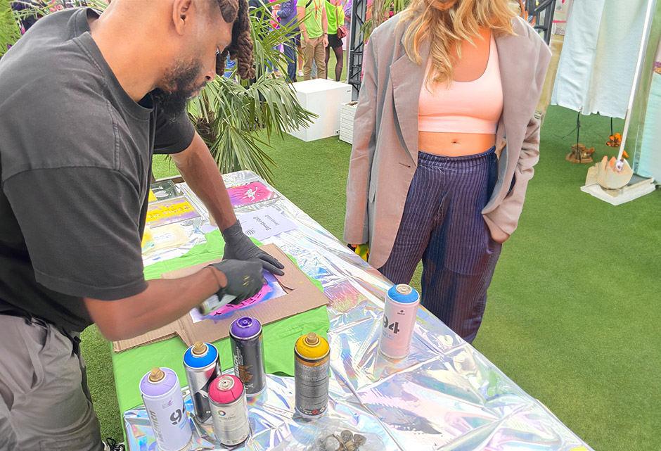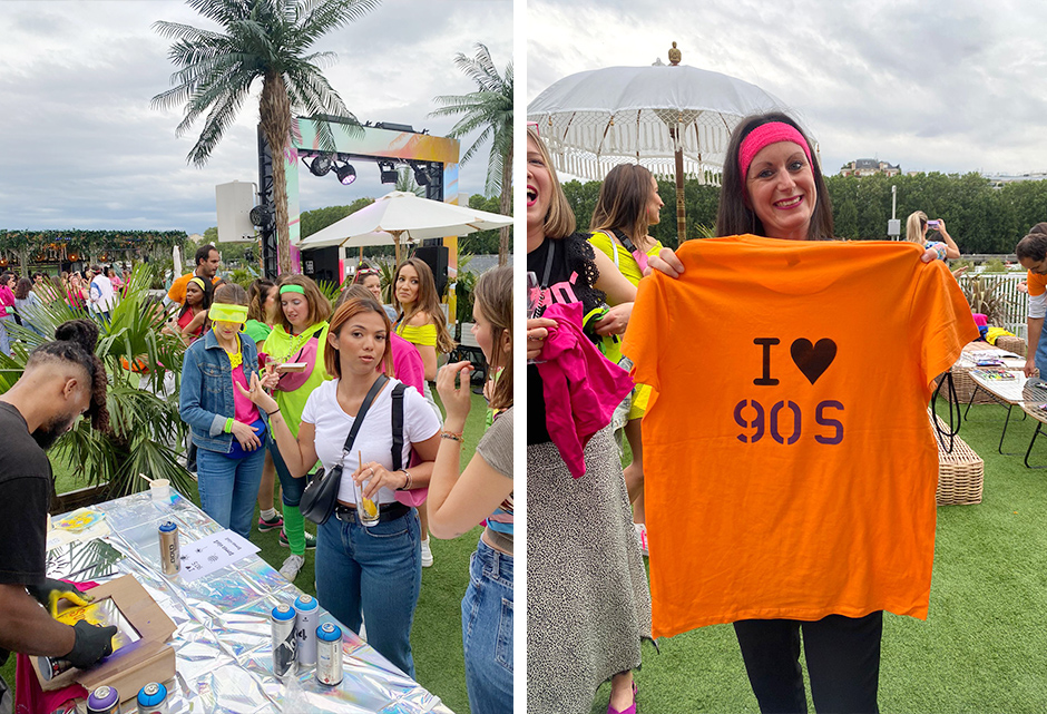 In this colorful and joyful setup, guests were invited to personalize their own T-shirts using stencils, spray paint, and creative slogans designed especially for the event. Each piece became unique, echoing the event’s creative direction and the 90s theme. This type of interactive brand activation perfectly aligns with the experiential culture that defines corporate and lifestyle events in Dubai — much like other immersive concepts we’ve developed such as the L’Oréal Urban Decay Dubai activation or the Maje Custom Experience.